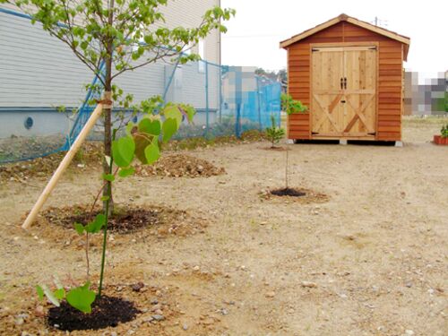 日曜日の午後、午前中に降った小雨の影響で物置小屋の壁が濡れてしまったので、塗装作業は中止し、植栽作業を一気に進めました。現在の植栽は50cm以下の小さな苗木が中心で、入手して植栽待ちになっていた苗木たちを順に植えていきました。 庭の南部分に…