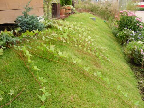我が家は道路に面した法面の上部にアイビーを3苗植えています。粘土質の土壌にもかかわらず、夏までにすくすく成長し、蔓が法面の芝生部分に垂れ下がるくらいまでになりました(写真1枚目)。夏に試しに蔓を切って鹿沼土に挿しておいたところ、うまく根付…