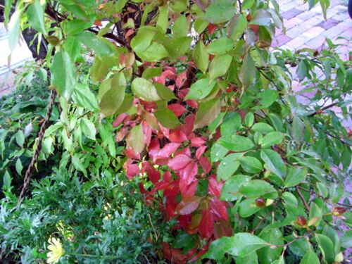 今年は9月の残暑はそれほど厳しくなく、涼しい日、雨の日が多かったせいか、秋の訪れが早いようです。庭を見渡すと、早くも赤く色付き始めた木々を見ることができます。 北側にある玄関門柱脇のヒメシャラは、一部の枝の葉が既に真っ赤に変っていました(写…