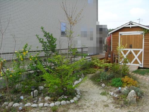 我が家の庭の南側、ちょうどリビング・デッキの正面に当たる場所には紅葉する木々を中心に植えた通称“雑木コーナー”があります。4月に入って順に芽吹き始め、かなり緑が増えてきました(写真1・2枚目)。 フェンス沿いの植え込みには、2週間ほど前に芽吹…