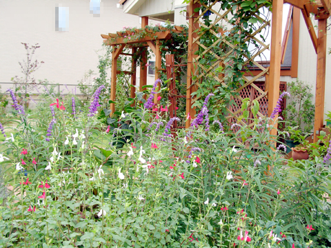 庭の東側には、昨年からセージ類がいくつか植わっていますが、今年はひと回り大きな株になって花を咲かせています(写真1枚目)。チェリーセージ(写真2枚目)は、赤と白のかわいい花で“イチゴミルク”とも呼ばれている品種です。花を見ると、まさにピッタリの名前という感じがします。メキシカンセージ(写真3枚目)は、この紫色の花が鮮やかで存在感があり、気に入っています。今年は株が昨年より大きくなって迫力が増したので、これからもっと大きくなるのが楽しみです。